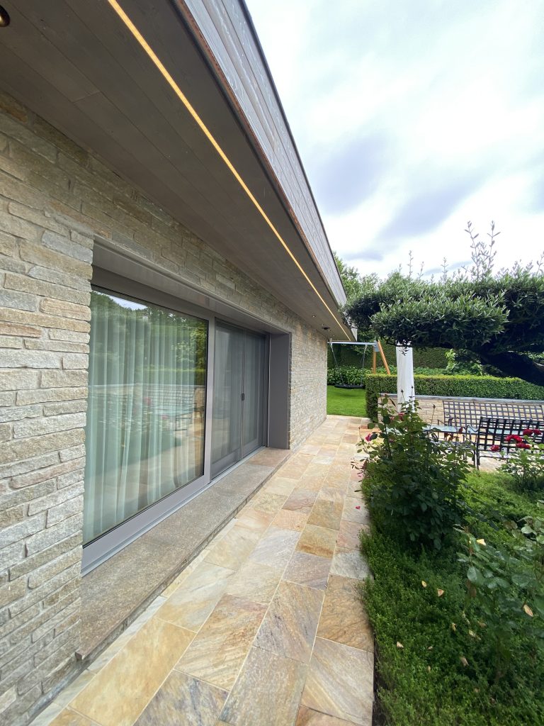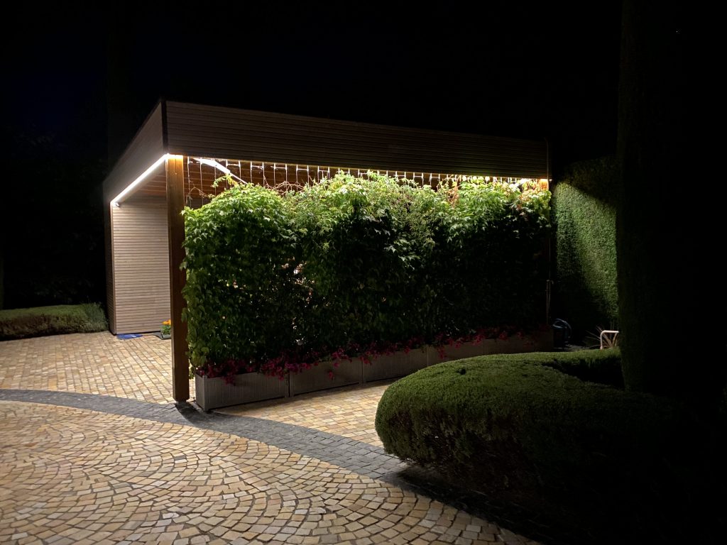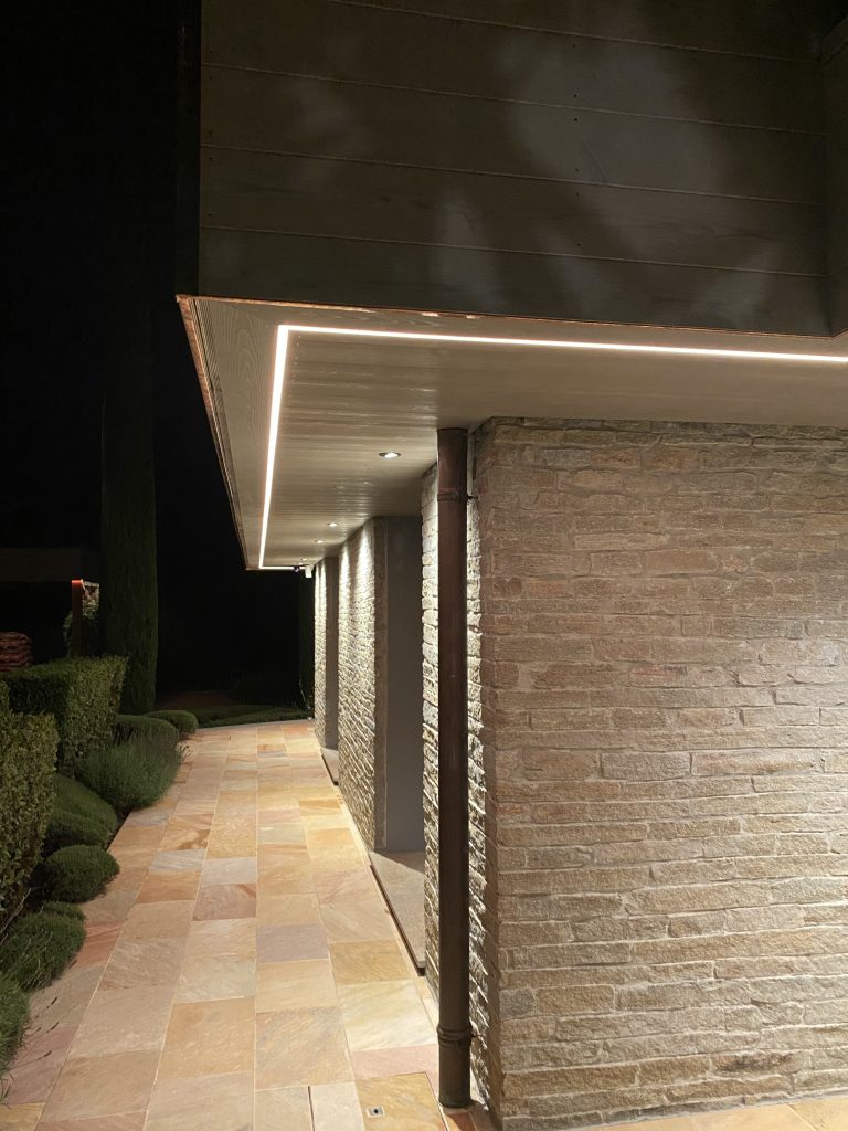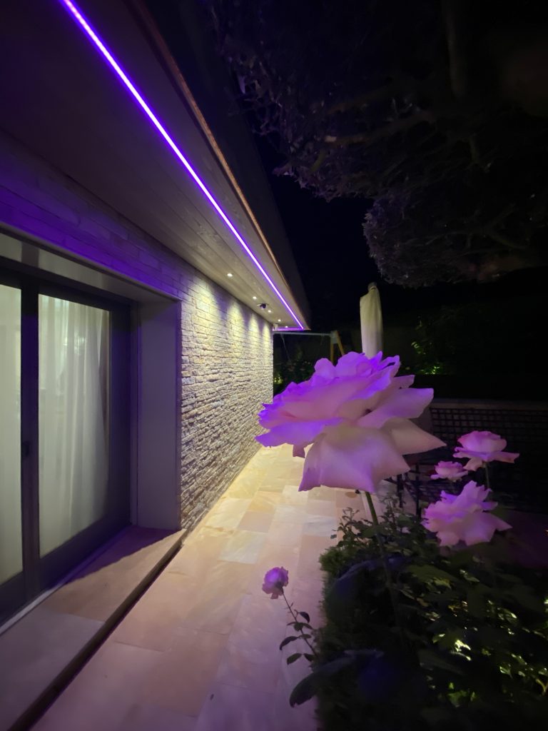 L’installation de bandes LED en périphérie de la villa, associée à des spots encastrés, crée une atmosphère douce et élégante lorsque les éclairages s’animent à la tombée du jour.