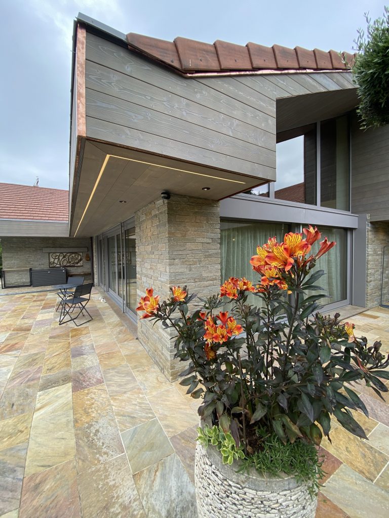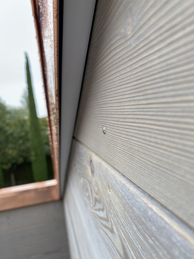 Notre intervention s’est articulée autour d’un travail précis sur l’éclairage extérieur et la mise en œuvre d’un bardage en mélèze de Sibérie Gris 102 Massif brossé de chez Sivalp.